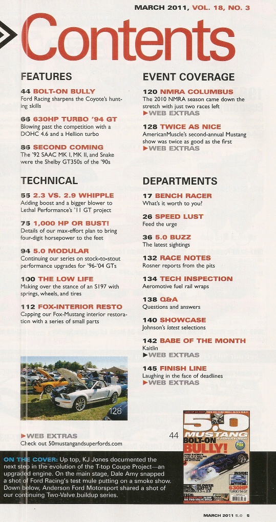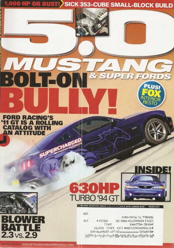 Reviews 5.0 MUSTANG 2011 MAR - WHIPPLE SHOOT-OUT, 353ci BUILD-UP, FOX INTERIOR REDO