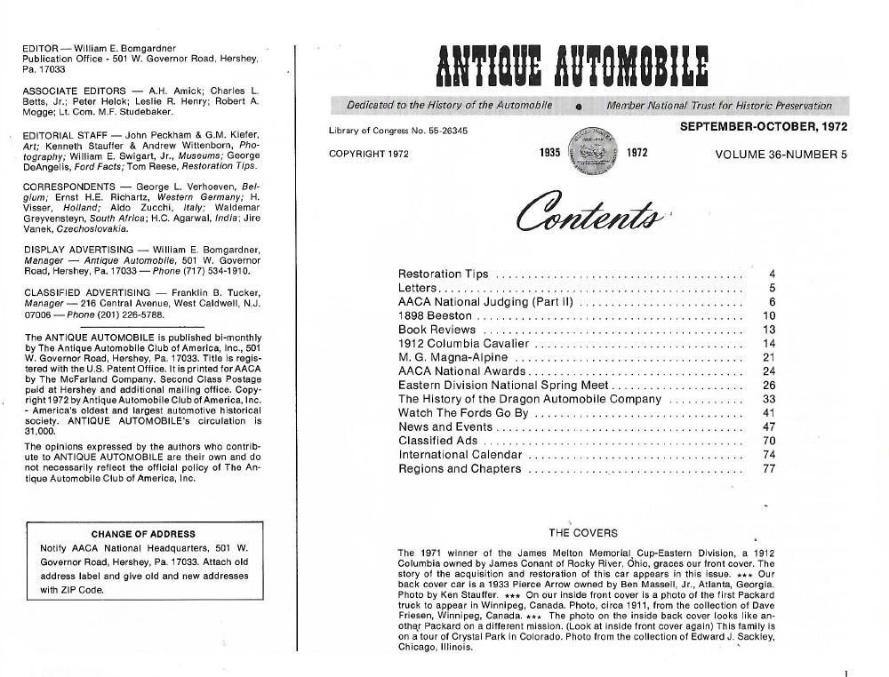Reviews ANTIQUE AUTOMOBILE 1972 SEPT - '12 COLUMBIA, '33 PIERCE ARROW, PACKARD TRUCK