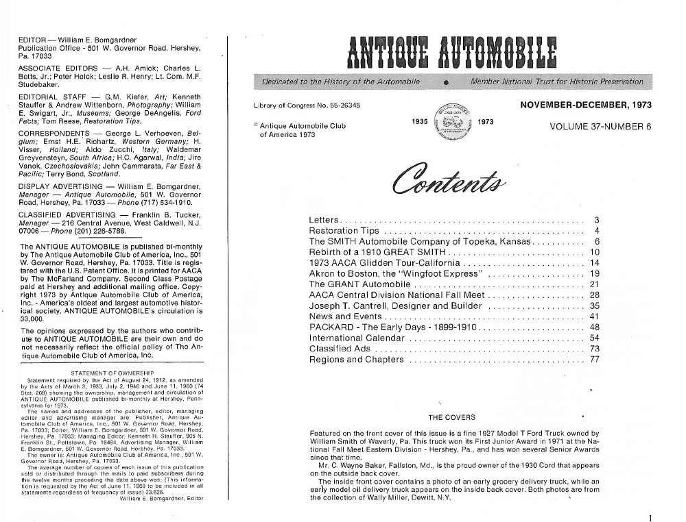 Reviews ANTIQUE AUTOMOBILE 1973 NOV - '27 MODEL T TRUCK, '30 CORD, PACKARD 1899-1910