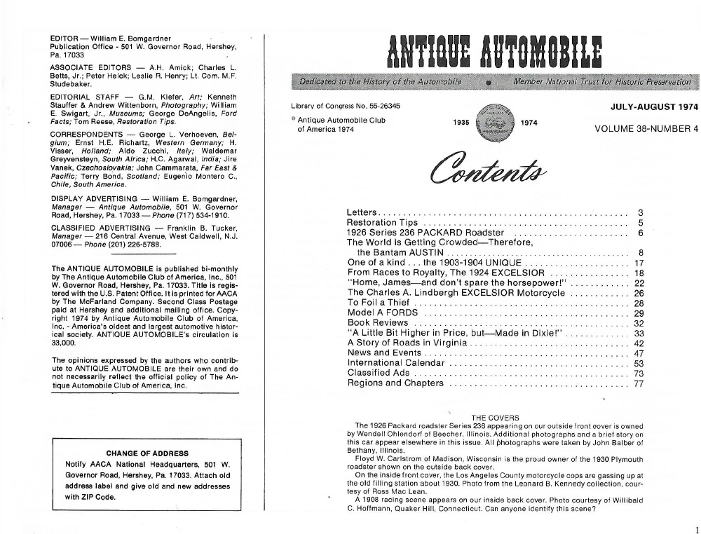 Reviews ANTIQUE AUTOMOBILE 1974 JULY - '26 PACKARD SER 236, '30 PLYMOUTH, '24 EXCELSIOR