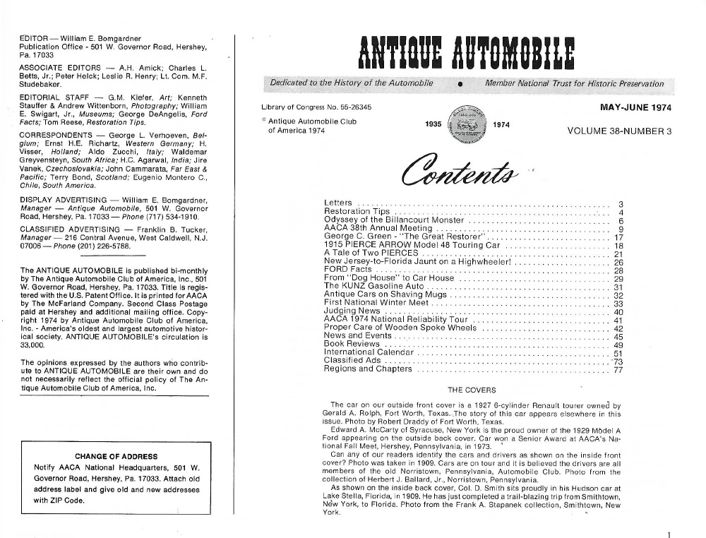 Reviews ANTIQUE AUTOMOBILE 1974 MAY - '27 6- CYL RENAULT, '29 MODEL A, KUNZ, '15 PIERCE