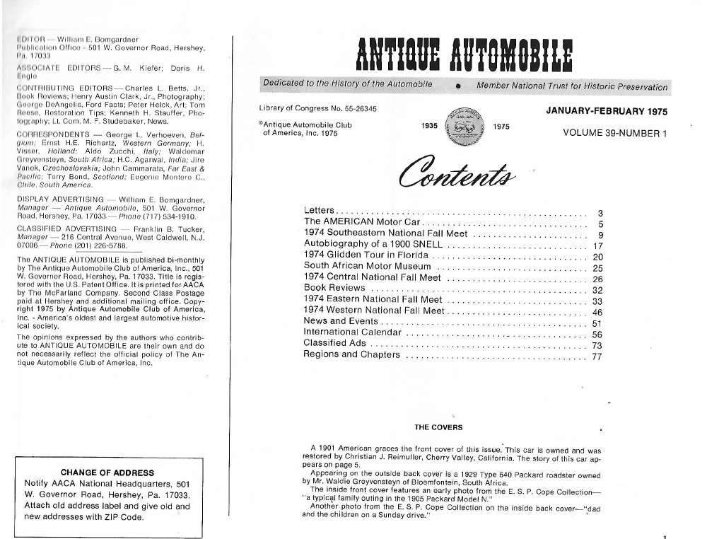 Reviews ANTIQUE AUTOMOBILE 1975 JAN - '1901 AMERICAN, '29 TYPE 640 PACKARD, '05 MODEL N