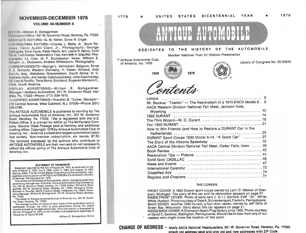 Reviews ANTIQUE AUTOMOBILE 1976 NOV - '30 DURANT, '22 DURANT, GOLD CADILLAC