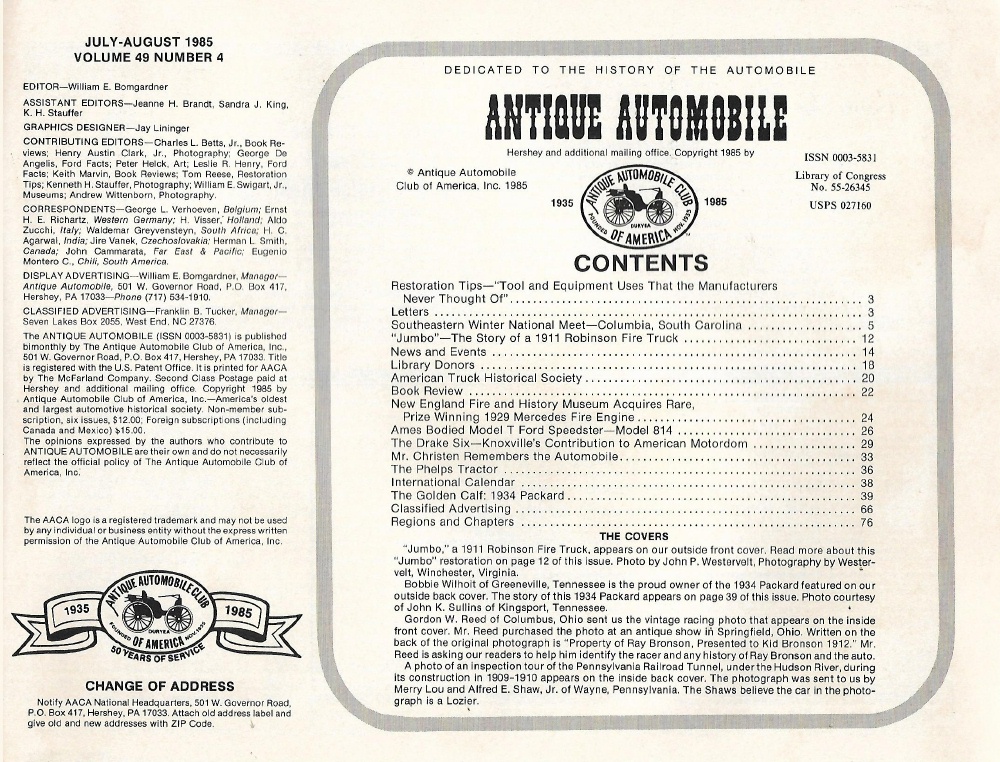 Reviews ANTIQUE AUTOMOBILE 1985 JULY - JUMBO - '11 ROBINSON FIRE TRUCK, '34 PACKARD