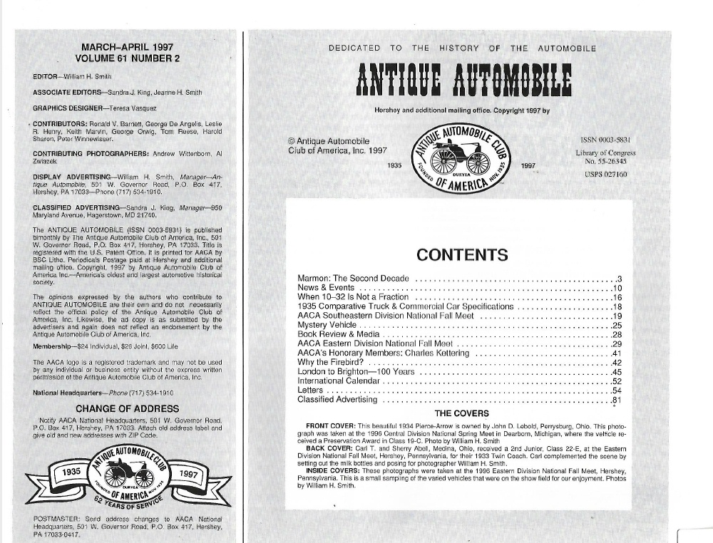 Reviews ANTIQUE AUTOMOBILE 1997 MAR - '34 PIERCE-ARROW, '33 TWIN COACH, FIREBIRD
