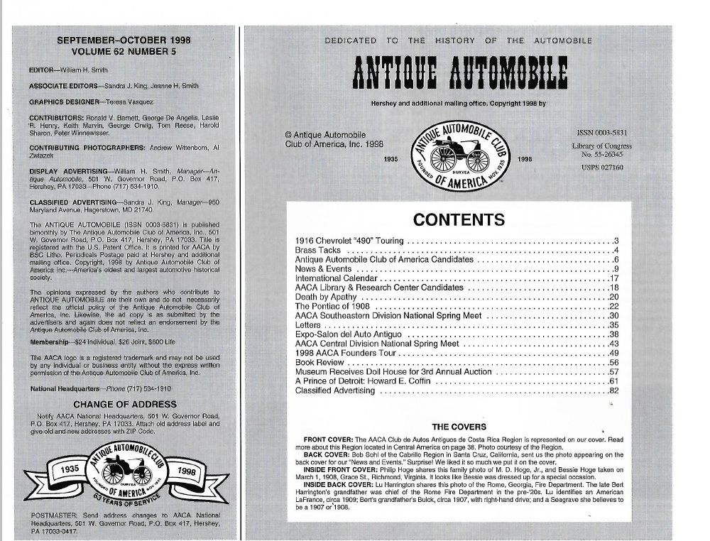 Reviews ANTIQUE AUTOMOBILE 1998 SEPT - SEAGRAVE, PONTIAC '08, '16 CHEVROLET "490"