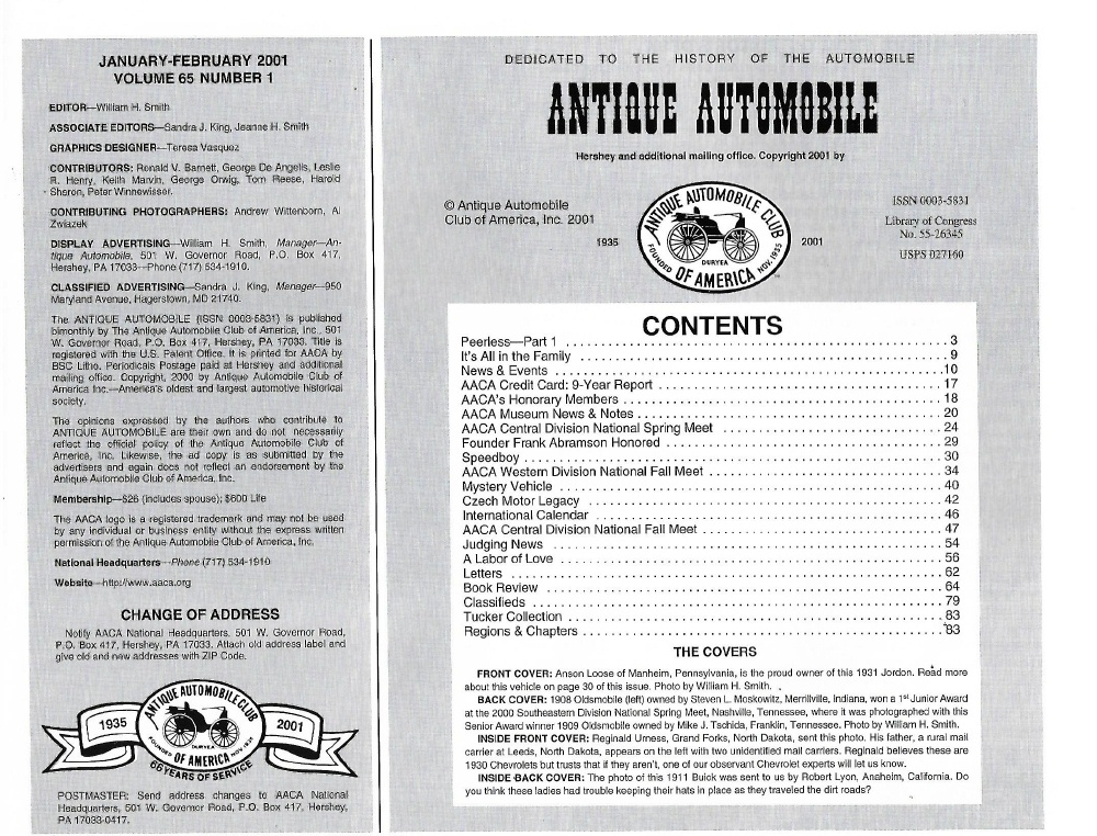 Reviews ANTIQUE AUTOMOBILE 2001 JAN - PEERLESS PT 1, '31 JORDON, '08 OLDS, '30 CHEVY
