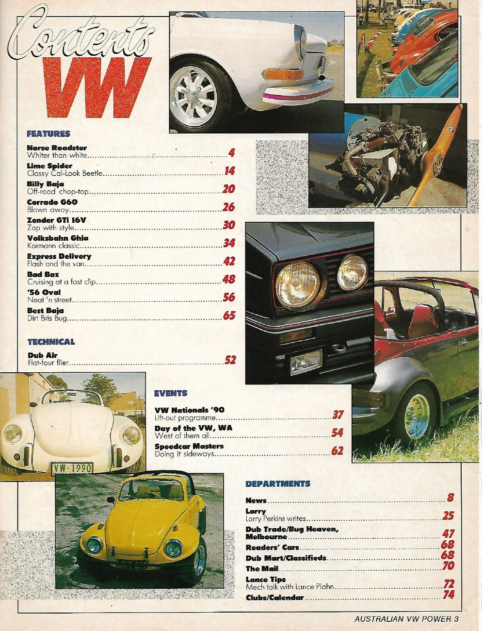 Reviews AUSTRALIAN VW POWER 1990 FEB - SPIDER '65 BEETLE, TYPE 3 VAN, ZENDER GTi 16V