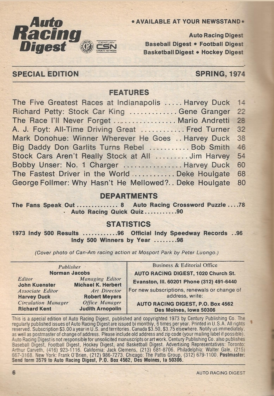 Reviews AUTO RACING DIGEST 1974 SPRING - RICHARD PETTY, AJ FOYT, DONOHUE, GABELICH