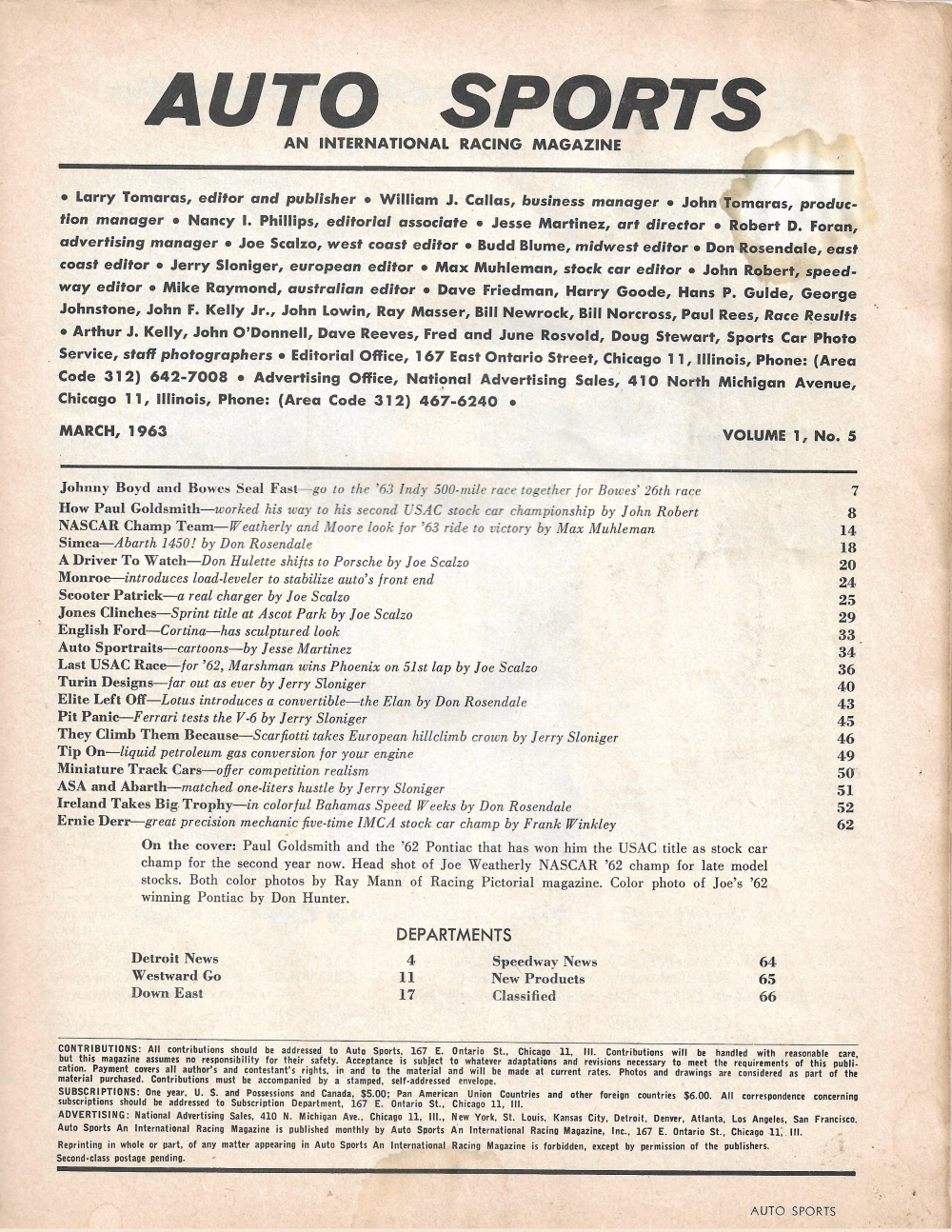Reviews AUTO SPORTS 1963 MAR - INTERNATIONAL RACING, FERRARI V6, ASA, ABARTH, LOTUS*