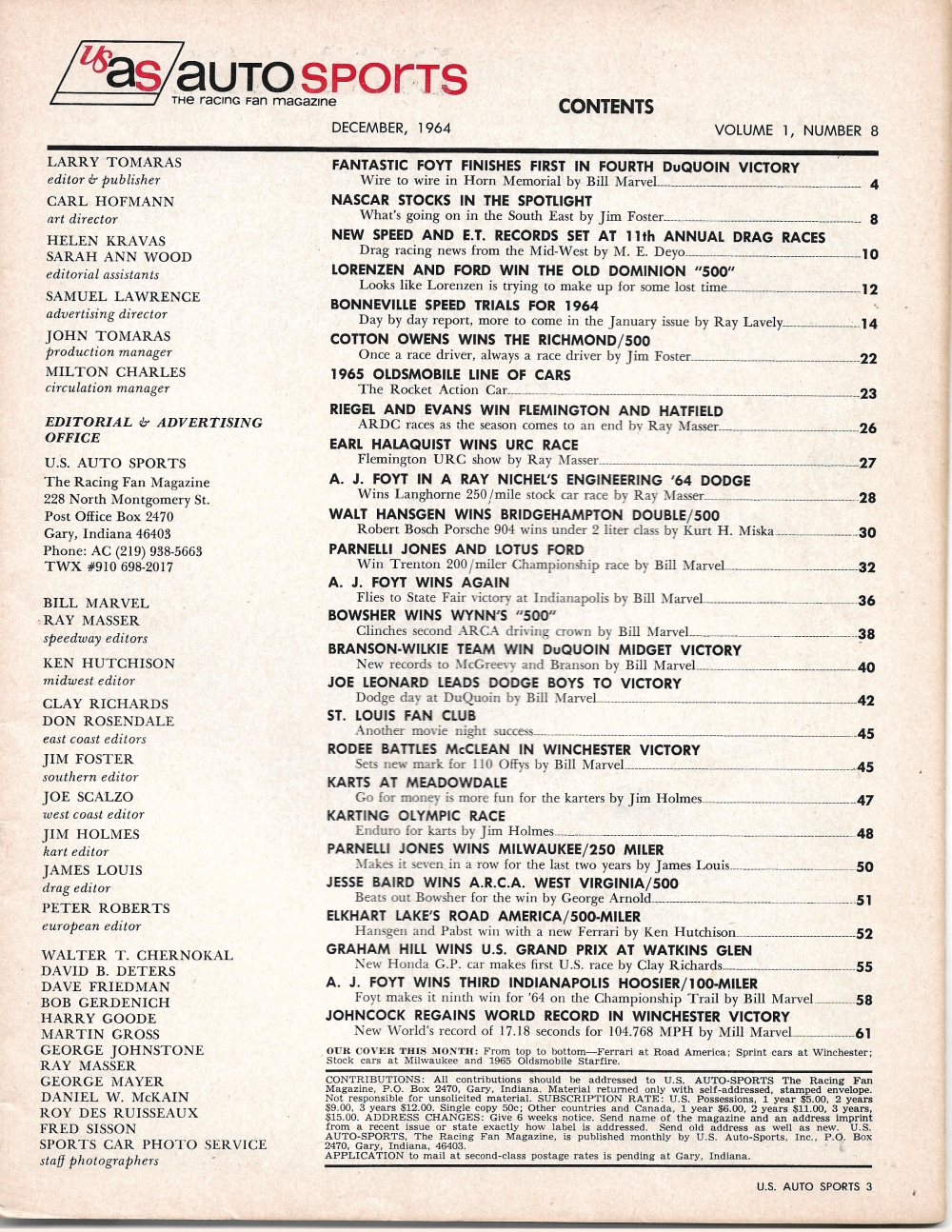 Reviews AUTO SPORTS 1964 DEC - USAS RACING FAN MAGAZINE,'65 OLDS, BONNEVILLE TRIALS*