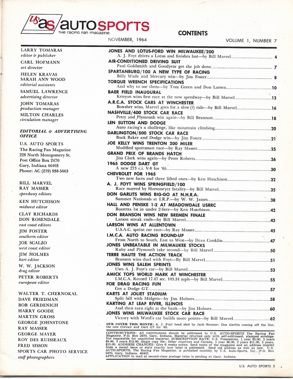 AUTO SPORTS 1964 NOV - USAS RACING FAN MAGAZINE, GARLITS, RACE REPORTS*
