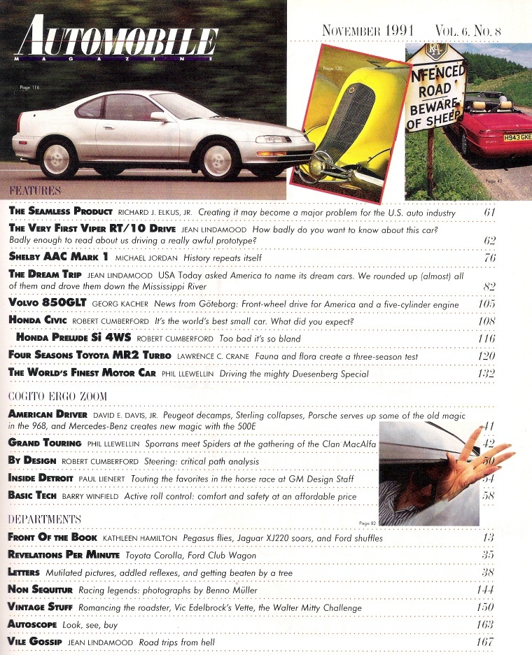 AUTOMOBILE 1991 NOV - SHELBY AAC MUSTANG,VIPER, VOLVO 850GLT,CIVIC,PRELUDE, MR2