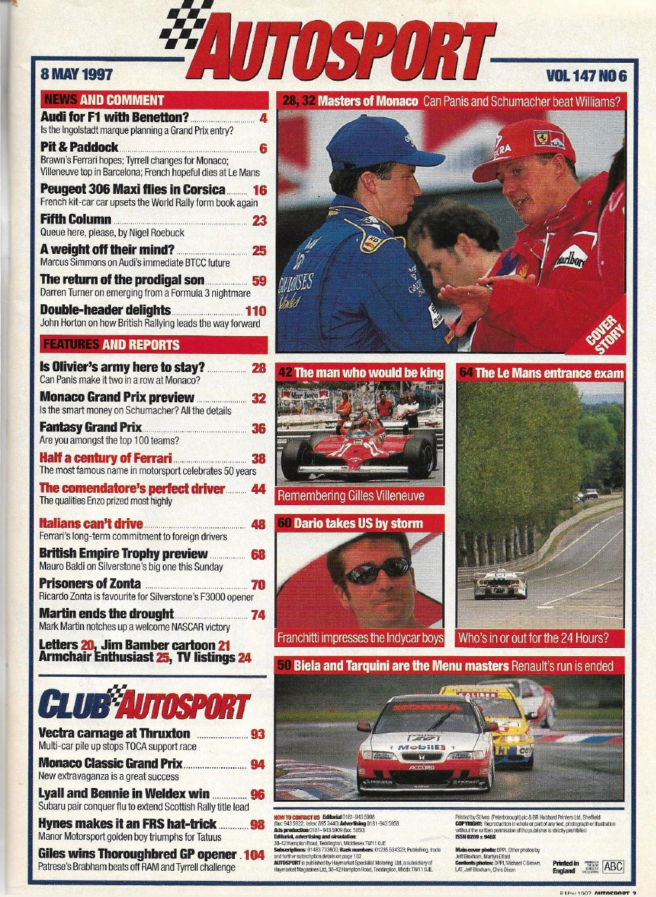 AUTOSPORT 1997 MAY 08 - FRANCHITTI, VILLENEUBE, SCHUMACHER VS WILLIAMS