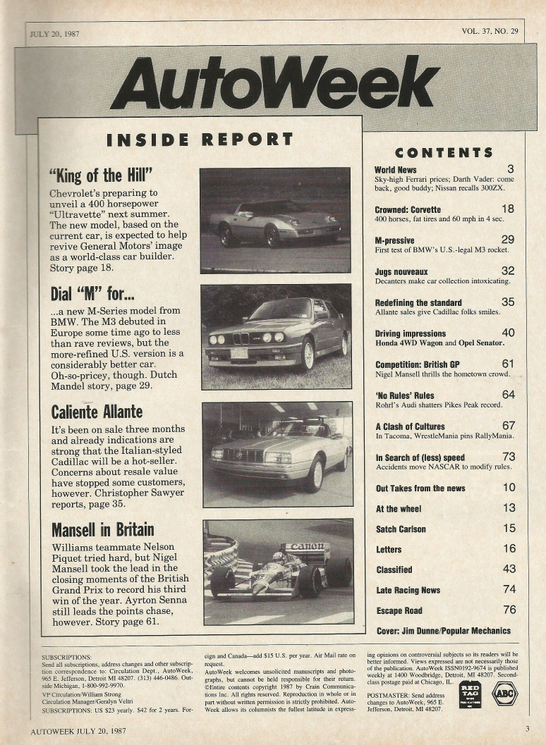 Reviews AUTOWEEK 1987 JULY 20 - ZR1 & CALLAWAY VETTES, BMW M3, ALLANTE, 1912 SIMPLEX