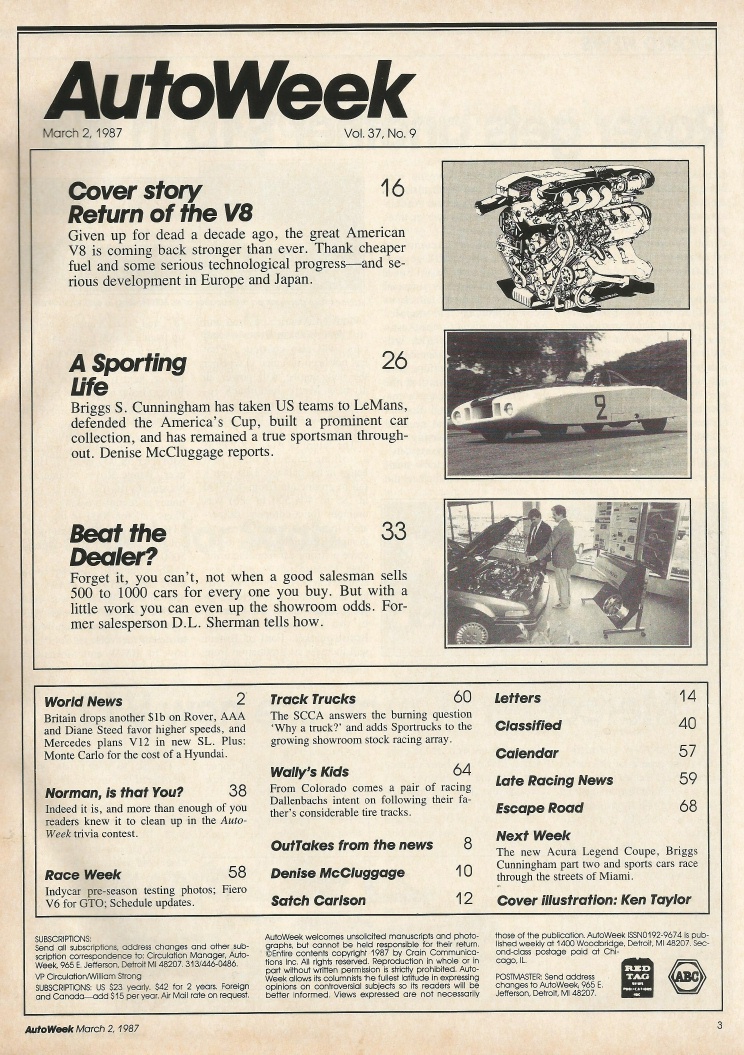 Reviews AUTOWEEK 1987 MAR 02 - CUNNINGHAM STORY, NEW V8s & V12s, SCCA SPORTRUNKS