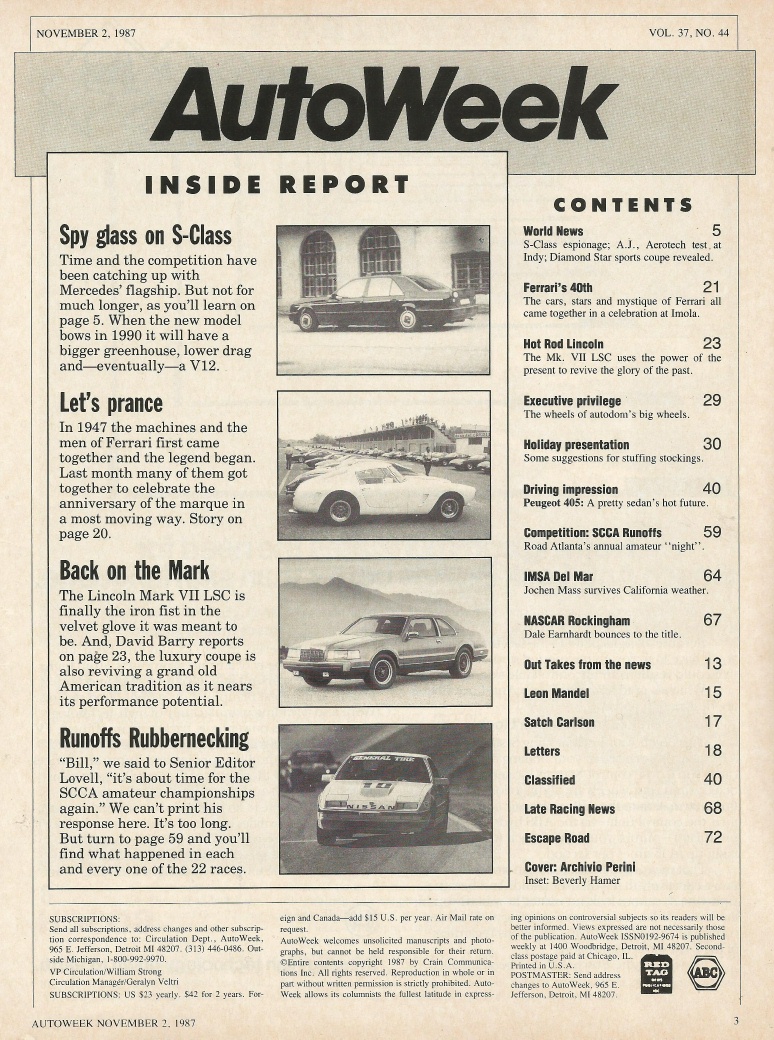 Reviews AUTOWEEK 1987 NOV 02 - RUNOFFS, MERCEDES S, LINCOLN LSC, FIAT 2300S GHIA COUPE