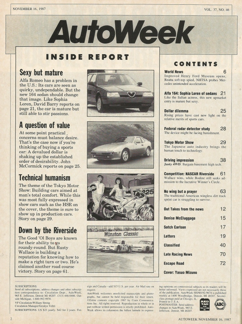 Reviews AUTOWEEK 1987 NOV 16 - MITSUBITISHI HSR, ALFA 164, BUGATTI ATLANTIQUE 57