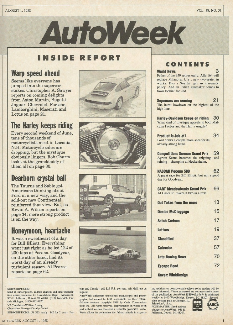Reviews AUTOWEEK 1988 AUG 01 - HARLEYs, DIABLO, NEW SUPERCARS, 1966 BIZZARRINI P538