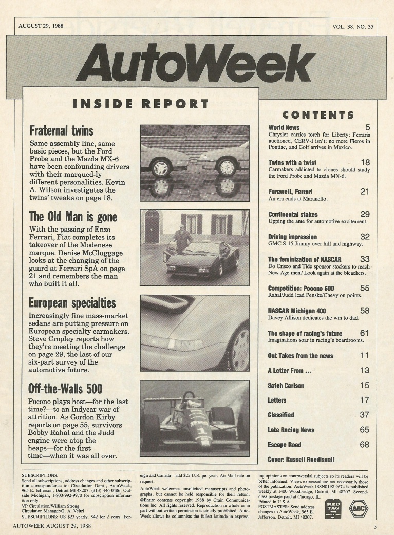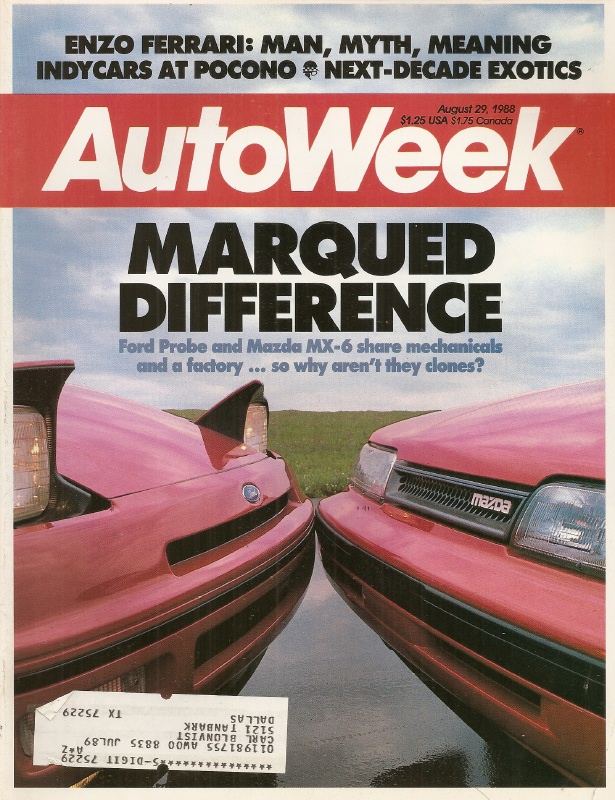 Reviews AUTOWEEK 1988 AUG 29 - ENZO Spcl, NEW EXOTICS, PROBE v MX-6, 1970 KING COBRA