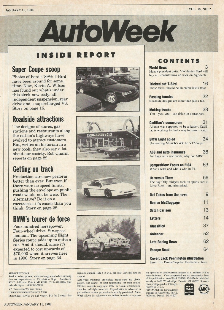 Reviews AUTOWEEK 1988 JAN 11 - NEW T-BIRD SC, BMW 8-SERIES, CITROEN-FORDS