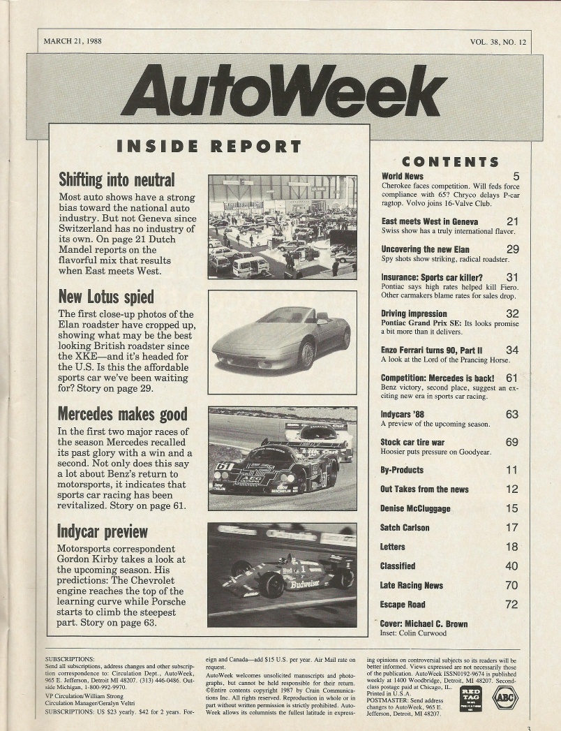 Reviews AUTOWEEK 1988 MAR 21 - M-B C10 AT JEREZ, ‘39 LAGONDA AIRLINE, NEW ELAN, GENEVA