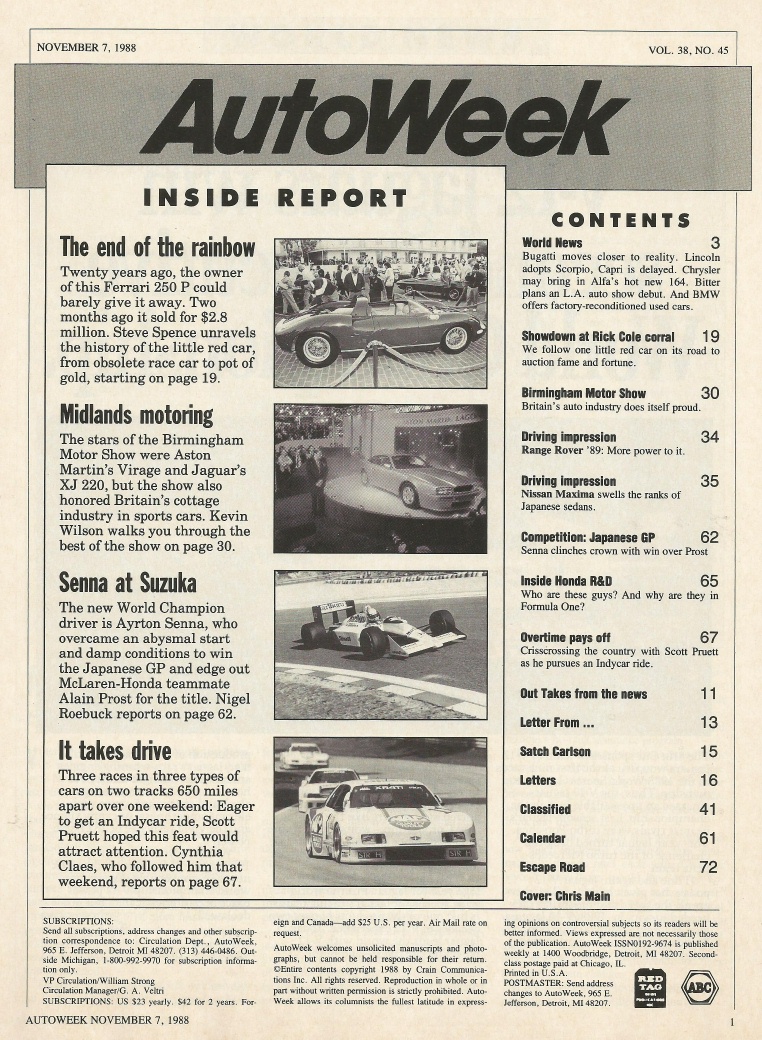 Reviews AUTOWEEK 1988 NOV 07 - SENNA, 1962 FERRARI 250 P, ARMSTRONG SIDDELEY HURRICANE