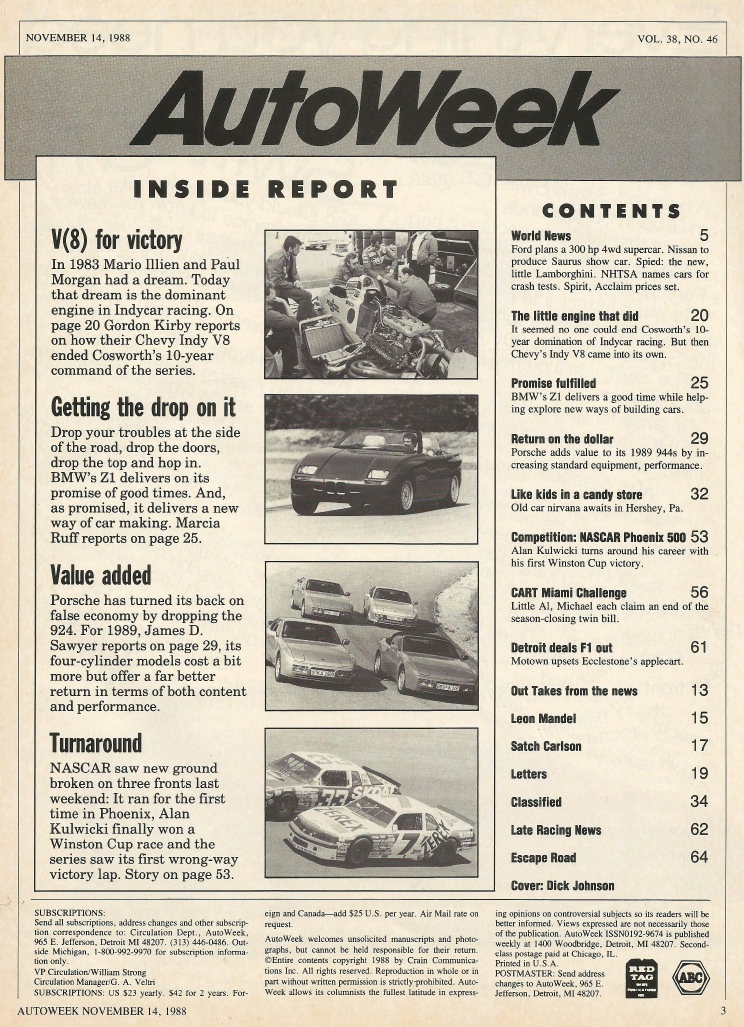 Reviews AUTOWEEK 1988 NOV 14 - BMW Z1, CHEVY INDY V8, 1939 FORD WOODIE, CART MIAMI