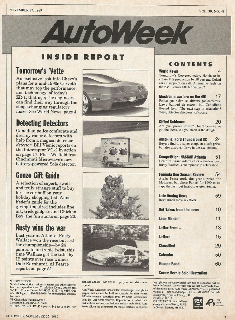 Reviews AUTOWEEK 1989 NOV 27 - T-BIRD SC, NEW VETTE DESIGN, '59 CORVETTE STING RAY