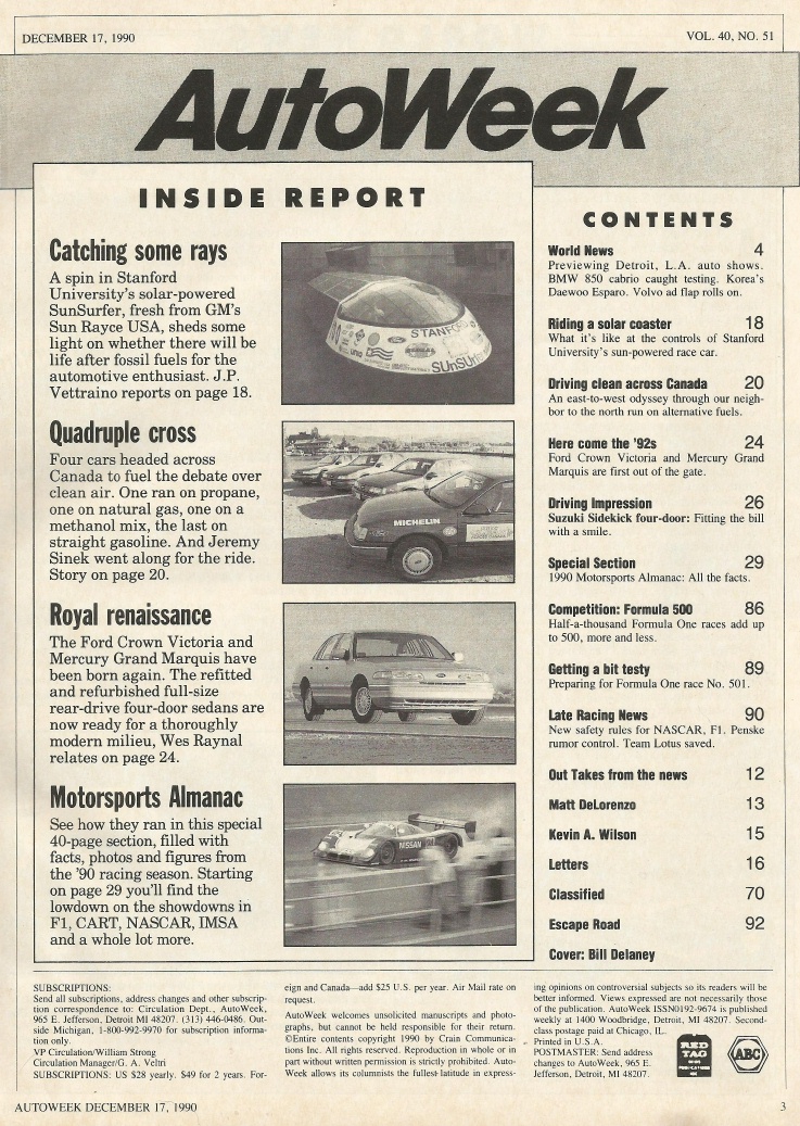 Reviews AUTOWEEK 1990 DEC 17 - NEW-n-OLD CROWN VIC, SUNSURFER, RACING Spcl, ECONO RUN