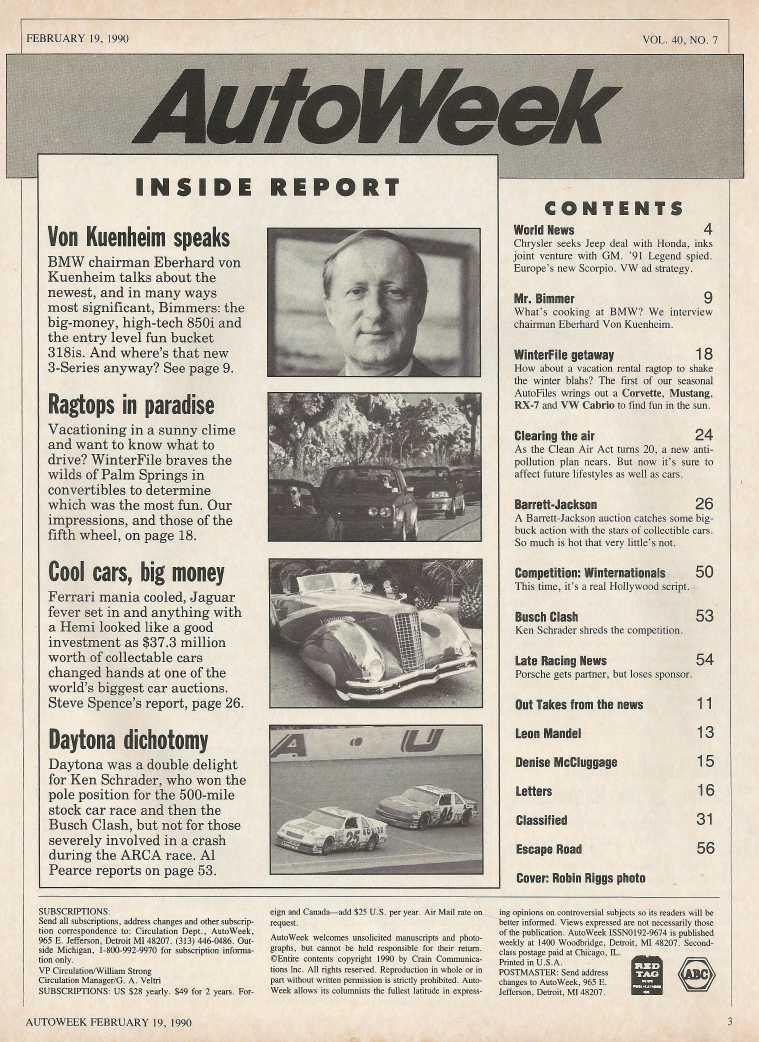 Reviews AUTOWEEK 1990 FEB 19 - VETTE, 5.0 GT, RX-7, VW CABRIOLET, '67 DART GT CONV
