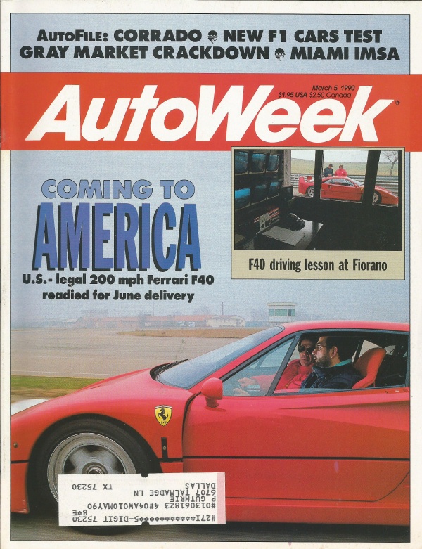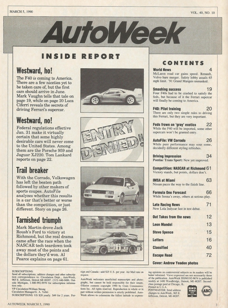 Reviews AUTOWEEK 1990 MAR 05 - VW CORRADO, F40, '57 FERRARI TESTA ROSSA, JERRY MOORE