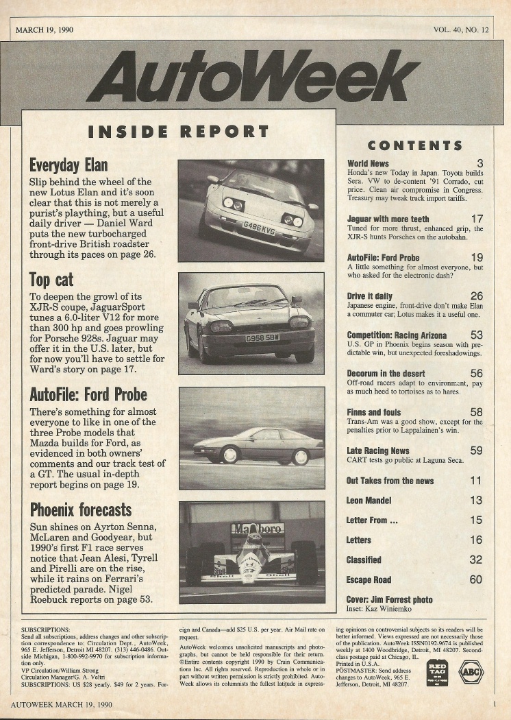 Reviews AUTOWEEK 1990 MAR 19 - JAG XJR-S, ELAN, FORD PROBE, GP of PHOENIX, SENNA, HWM
