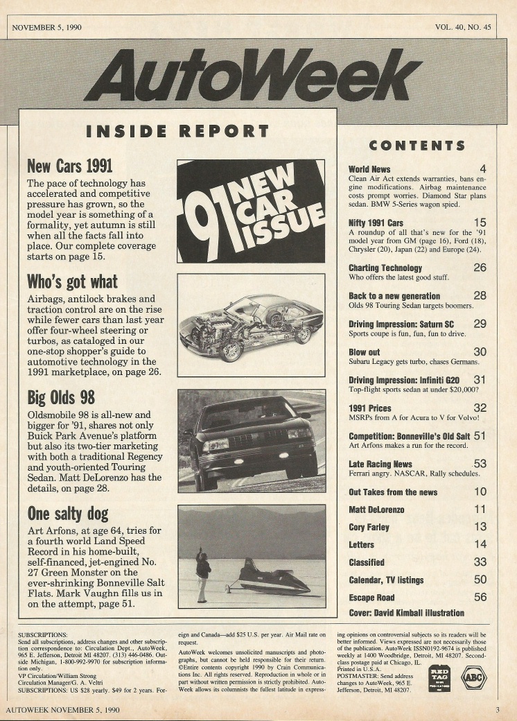 Reviews AUTOWEEK 1990 NOV 05 - NEW CAR ISSUE, FORD SPORTSMAN, ART ARFONS AT BONNEVILLE