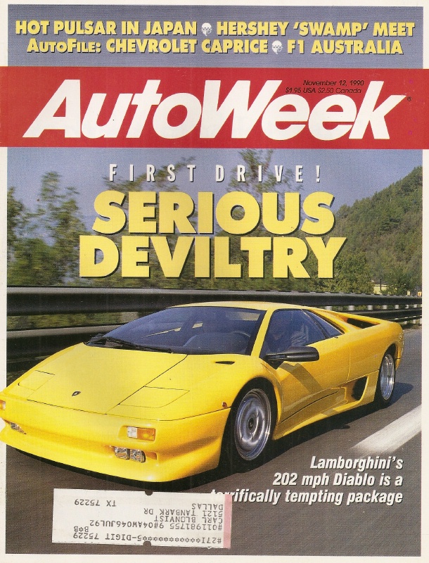 Reviews AUTOWEEK 1990 NOV 12 - DIABLO, PULSAR, CAPRICE, F1 AUSTRALIA, QUATTROPORTE