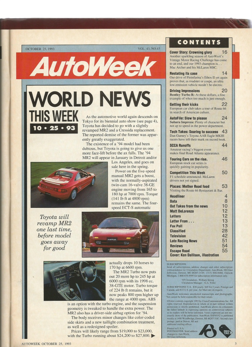 Reviews AUTOWEEK 1993 OCT 25 - SUBARU 360, BENTLEY TURBO R, ARCHER-M8C, ETHOS II