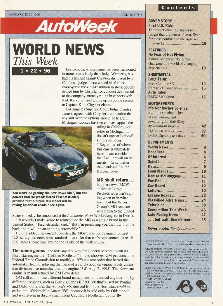 Reviews AUTOWEEK 1996 JAN 22 - JAMES GARNERs OLDS BANSHEE, FERRARI F50, BMW 540i SPORT