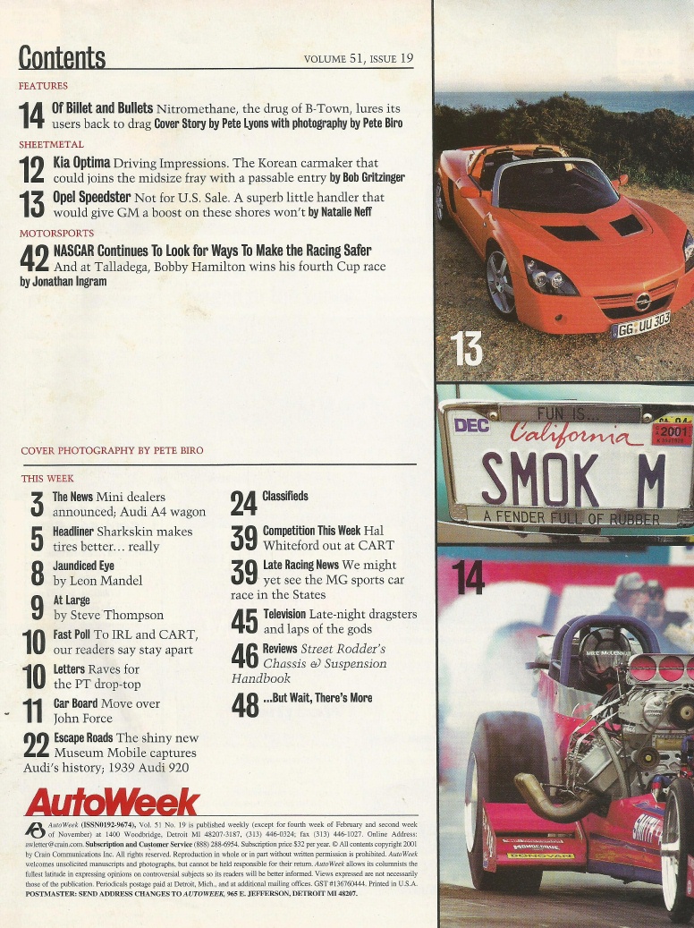 Reviews AUTOWEEK 2001 APR 30 - AUDI HISTORY & '39 920, OPEL SPEEDSTER, VINTAGE0 DRAGS