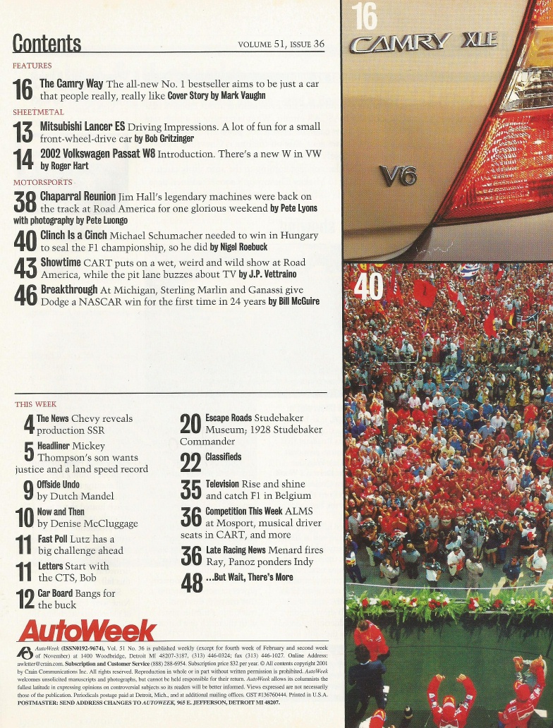 Reviews AUTOWEEK 2001 AUG 27 - CAMRY, LANCER ES, PASSAT W8, CHAPARRAL, '28 COMMANDER