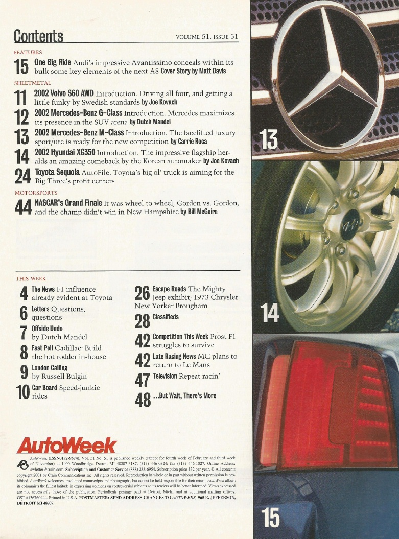 Reviews AUTOWEEK 2001 DEC 03 - AVANTISSIMO, '73 NEW YORKER, SEQUOIA, XG350, G&M CLASS