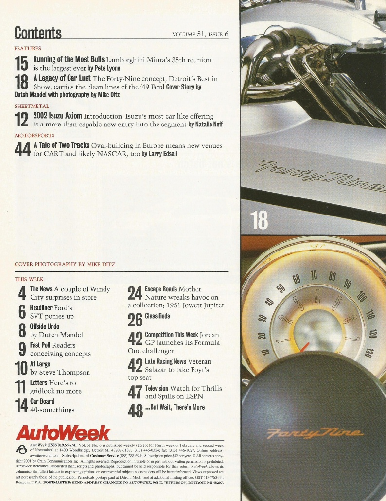 Reviews AUTOWEEK 2001 FEB 05 - FORD FORTY-NINE, MIURAs, JOWETT JUPITER, ISUZU AXIOM