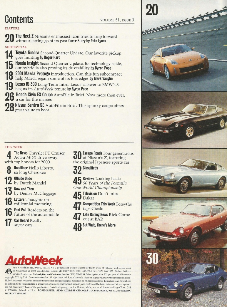 Reviews AUTOWEEK 2001 JAN 15 - NISSAN Z-CAR SPECIAL, LEXUS IS300, PROT?G?, INSIGHT
