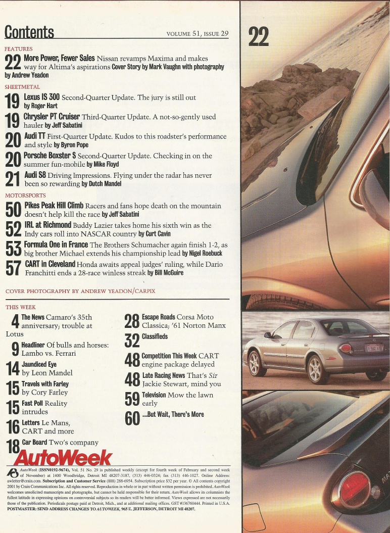 Reviews AUTOWEEK 2001 JULY 09 - MAXIMA, IS300, AUTI TT&S8, '61 NORTON MANX, BOXSTER S
