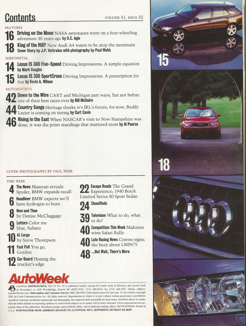 Reviews AUTOWEEK 2001 JULY 30 - AUDI A4, IS 300 5-Sp & SportCross, '40 BUICK Ltd 80