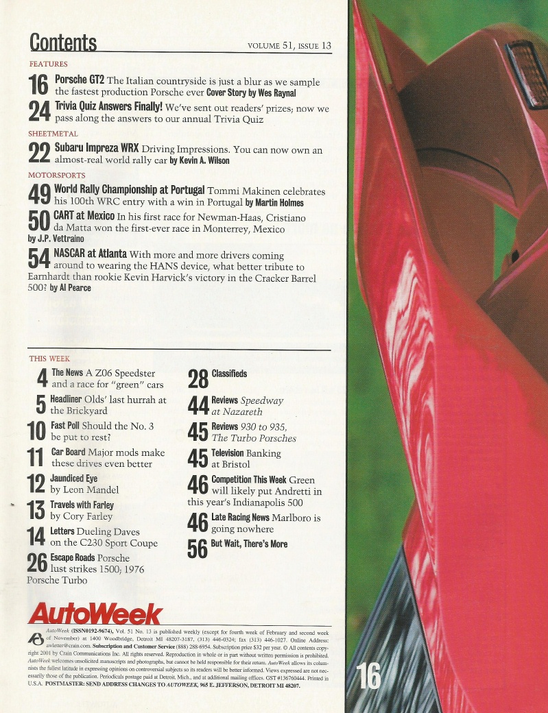 Reviews AUTOWEEK 2001 MAR 19 - PORSCHE GT2, SUBARU WRX, '76 PORSCHE TURBO CARRERA*