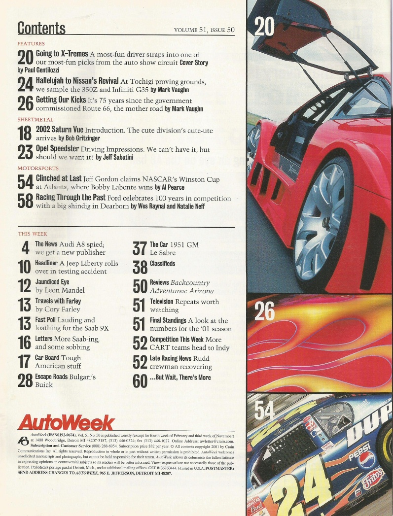 Reviews AUTOWEEK 2001 NOV 26 - OPEL OPC X-TREME, '51 BUICK LeMANS, 350Z vs G35, VUE