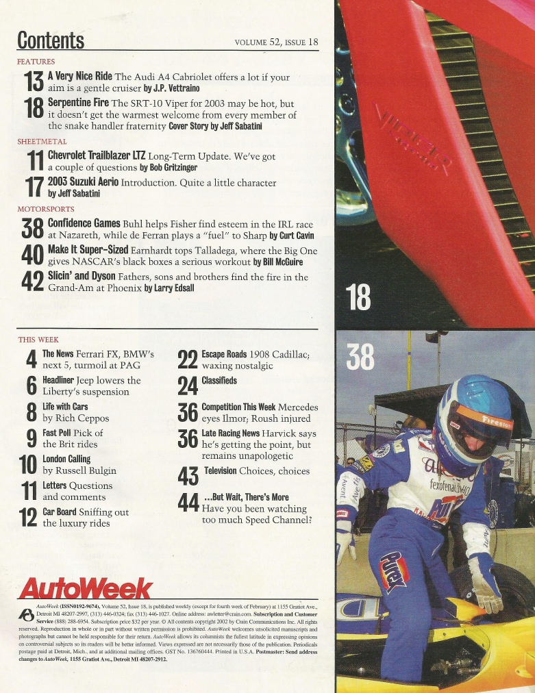 Reviews AUTOWEEK 2002 APR 29 - VIPER SRT10, SUZUKI AERIO, '08 CADILLAC, A4 CABRIOLET