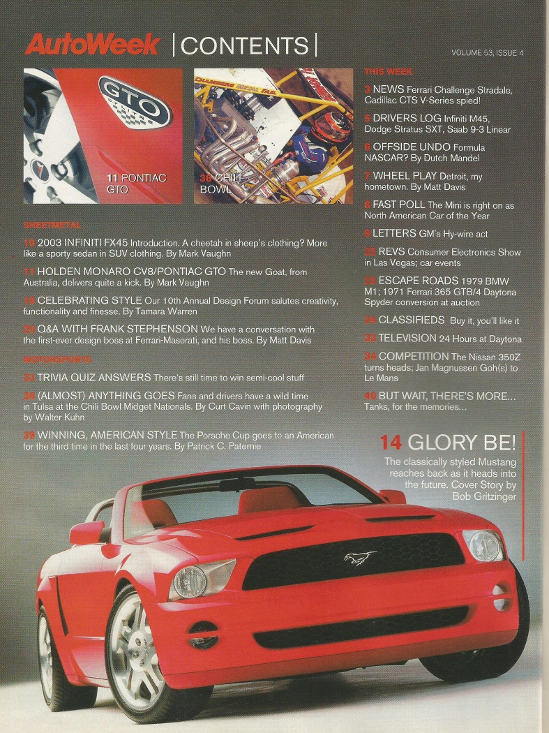 Reviews AUTOWEEK 2003 JAN 27 - NEW MUSTANG & GTO, INFINITI FX45 SUV, ‘79 BMW M1, CTS-V