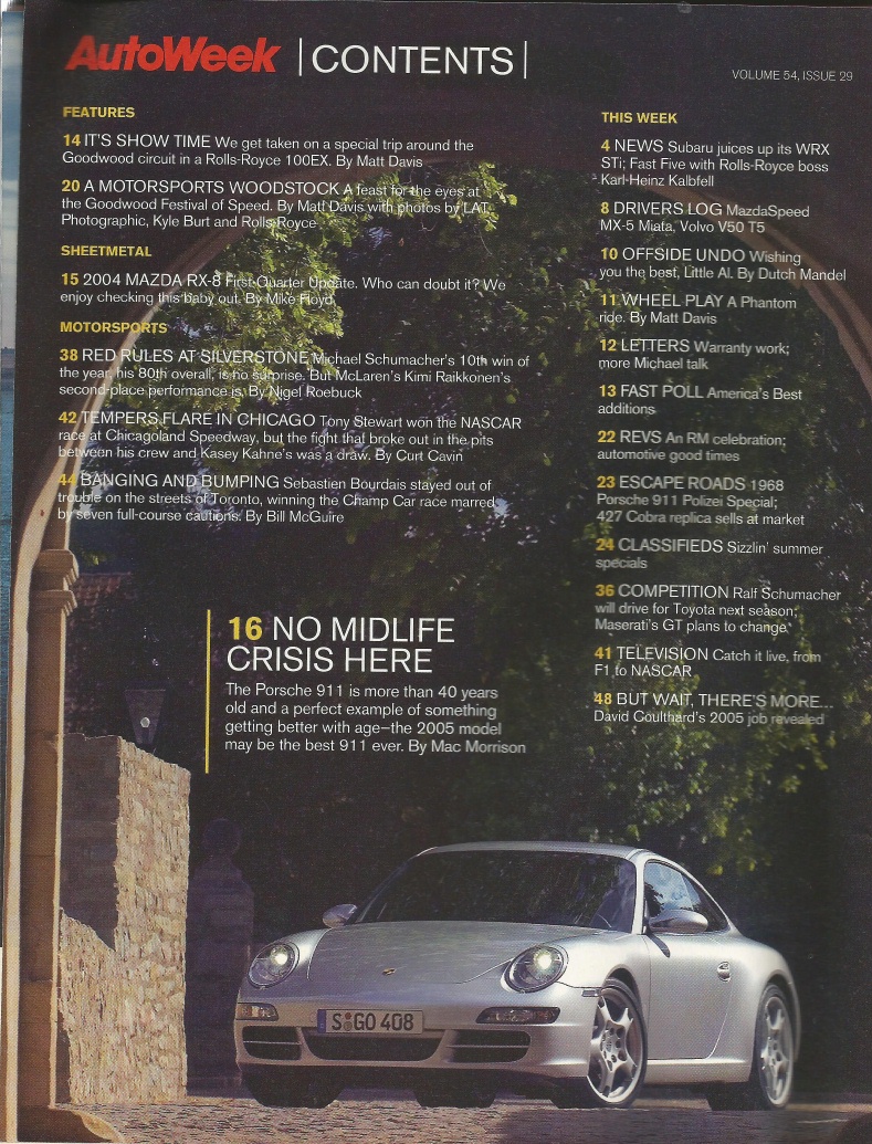 Reviews AUTOWEEK 2004 JULY 19 - NEW 911s, M-B CLS55, RX-8, RALF, R-R 100EX V16 9L