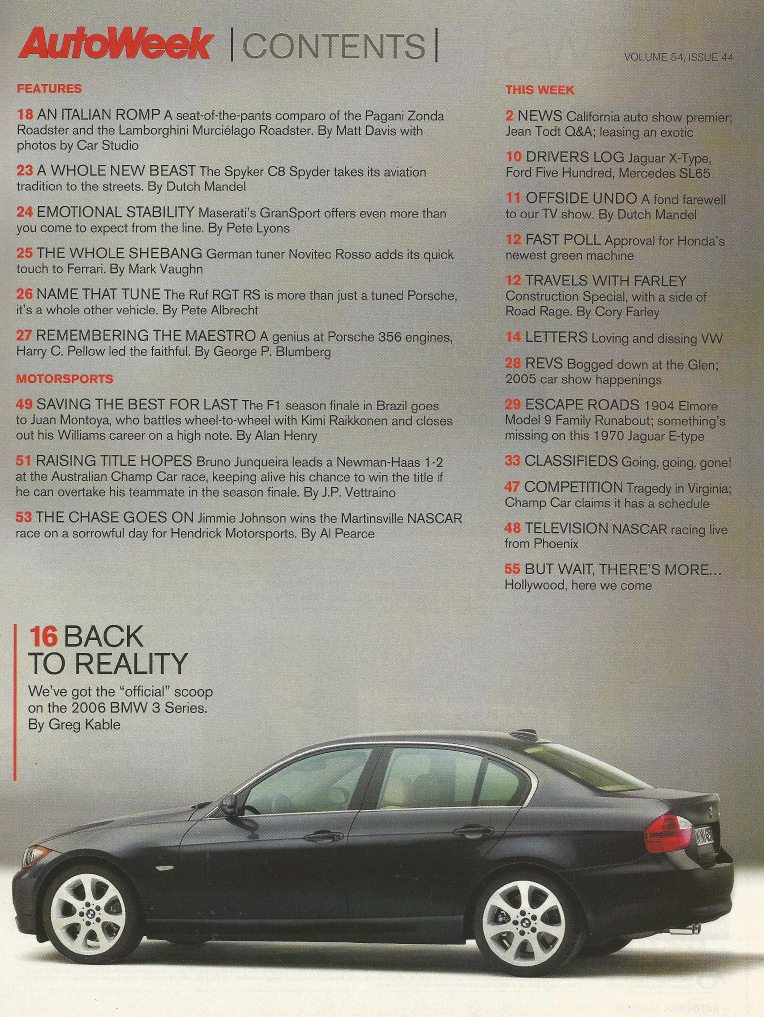 Reviews AUTOWEEK 2004 NOV 01 - BMW 330i, SPYKER C8 SPYDER, RUF RGT RS, PAGANI ZONDA